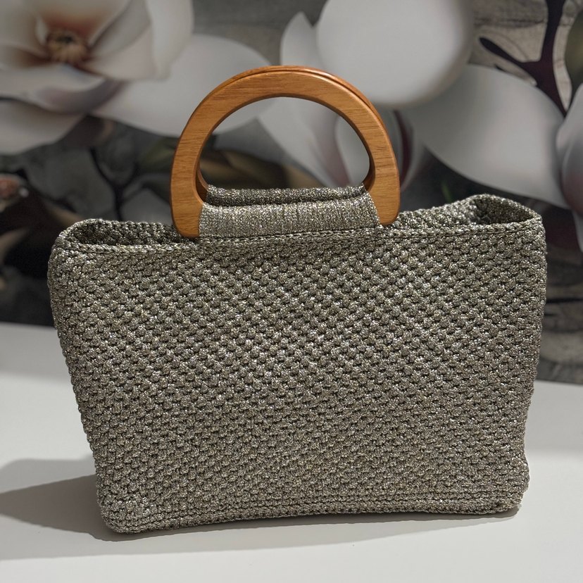 Ahşap saplı, gri örgü kadın çantası. Minimalist ve bohem tarzda, desensiz dokusu günlük kullanıma uygundur. İstediğiniz renkte üretilir 3 gün içinde kargolanır.