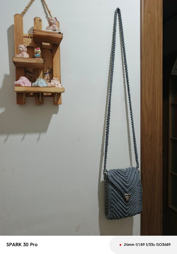 Gri örgü malzemeden bel detaylı, zincir askılı kadın çantasıdır. Minimalist ve bohem tarzda, günlük kullanıma uygundur. Düz desensizdir.