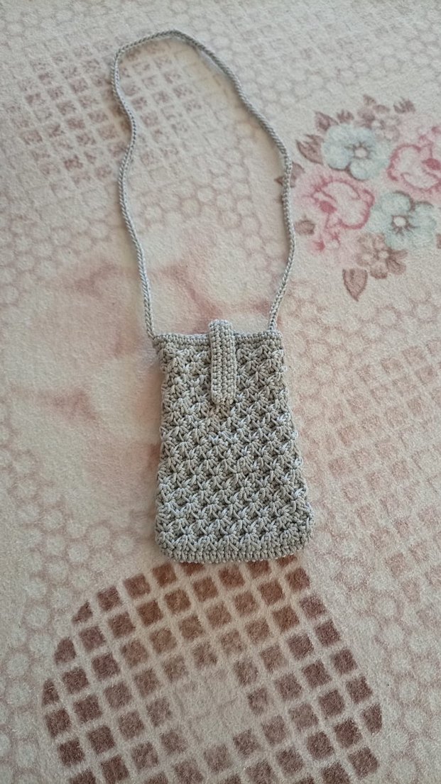 Gri Örgü Kadın Çapraz Telefon Çantası Dantel Detaylı