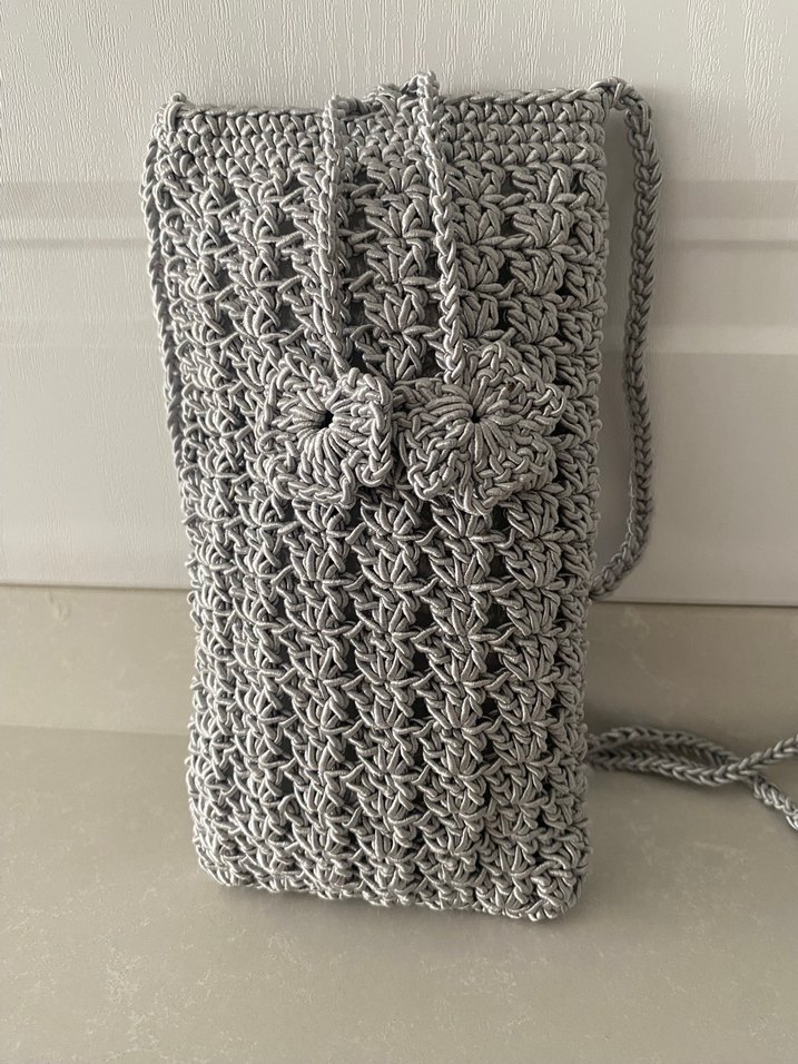 Kadınlar için gri örgü tasarımlı, rahat bohem tarzda çapraz telefonluk. Yumuşak dokulu, desen içermeyen sade görünüm. Günlük kullanım için uygun.