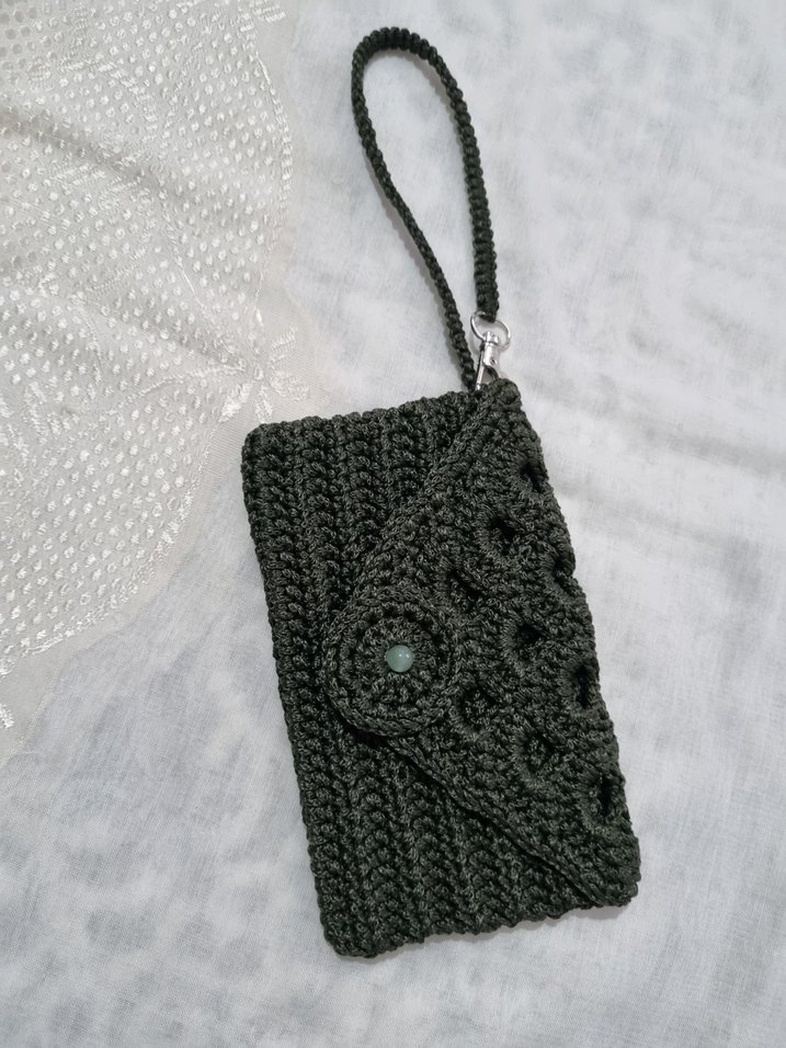 Gri örgü kadın clutch çanta, bohem tarzda dokulu desene ve kolay taşınması için bilek askısına sahiptir. Günlük kullanım için uygun.