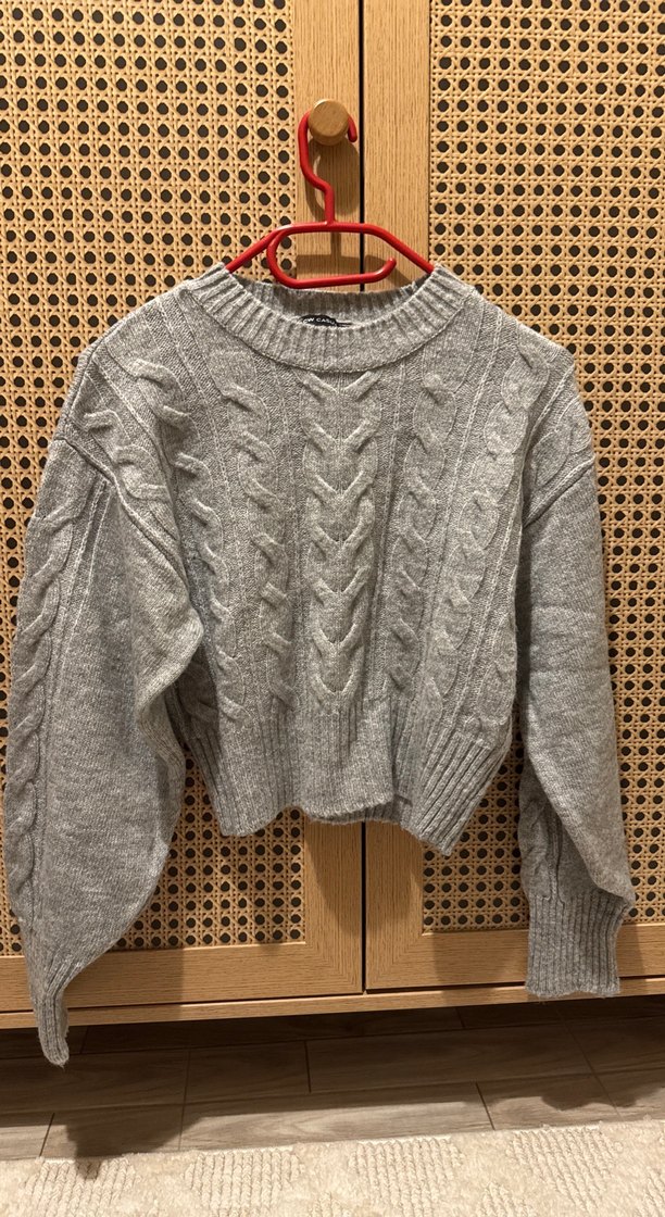 Gri renkli, örgü kumaştan yapılmış, yuvarlak yakalı ve uzun kollu, rahat kesimli crop kadın kazak. Bir kez giydim.