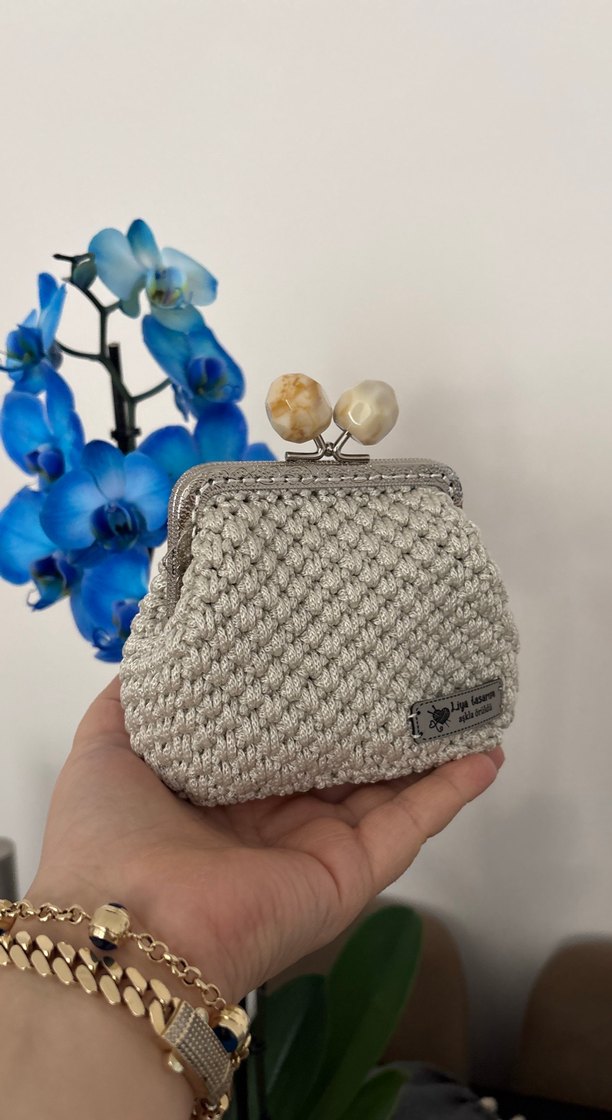 Gri renkte, yumuşak dokulu örgü kadın cüzdan, boncuklu vintage tarzı kapama ile günlük kullanıma uygun rahat ve bohem bir görünüme sahiptir.