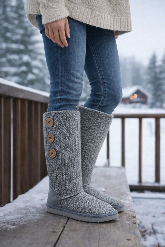 Gri örgü kadın çizme, dolgu topuklu ve üç düğmeli detaylarla günlük kullanıma uygun rahat ve normcore bir stil sunar. ❄️