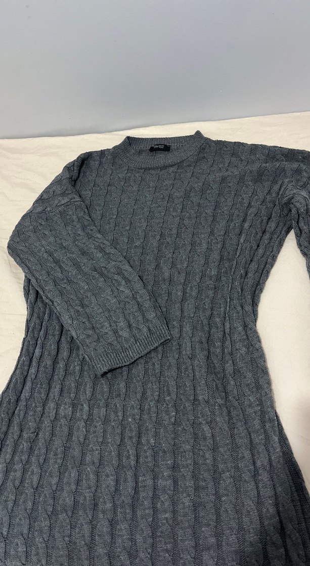 Gri renkli, uzun kollu, yuvarlak yakalı örgü kadın elbise. uzun boy, oversize rahat ve şık bir tercih.