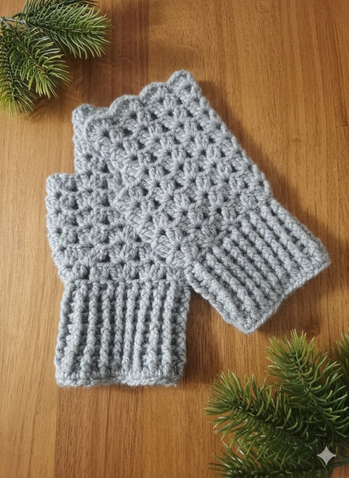 Gri renkte, yumuşak örgü kumaştan yapılmış, bohem tarzda ve rahat kadın eldivenleri.