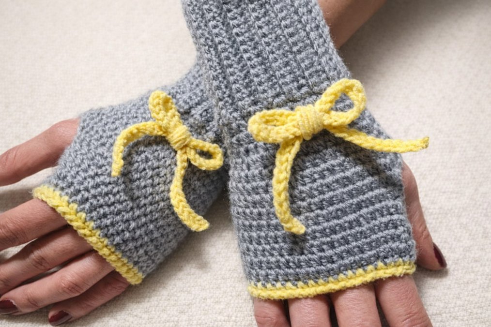 Gri örgü kadın eldiveni, sarı fiyonk detaylarıyla bohem tarzı için uygun, sıcak ve rahat bir dokuya sahiptir.