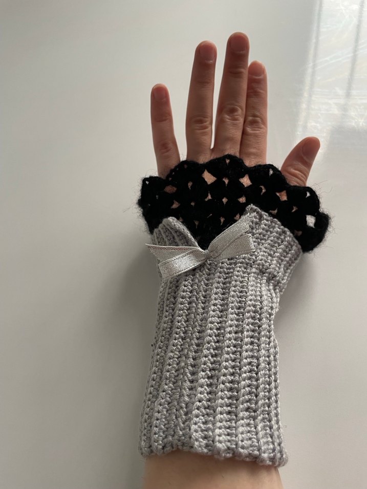 Gri örgü kadın eldiveni, siyah dantel ve kurdele detaylarıyla rahat ve şık gotik tarz sunar.