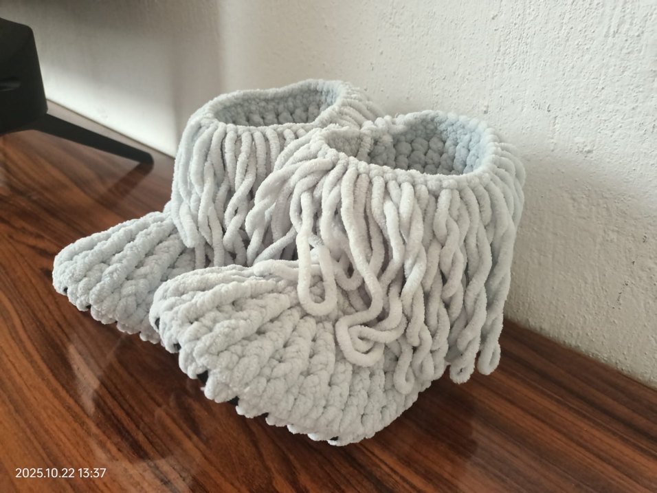 Kadın gri renkte, örgü dokulu ve bohem tarzda sıcak ev terlikleri. Püsküllü tasarımıyla rahatlık sunar. istenilen renkte modelde yapılır ürün 38-39numaradır