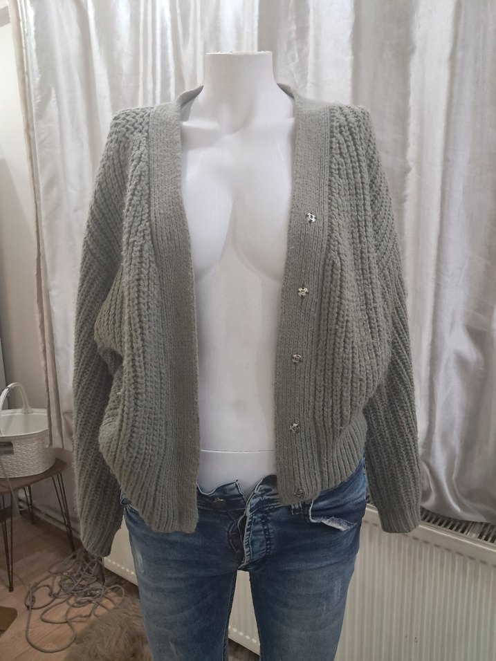Gri örgü kadın hırka, uzun kollu ve yuvarlak yaka, bol kesimle rahat ve gündelik bir tarz sunar. ✨sadece biraz tüylenme var
