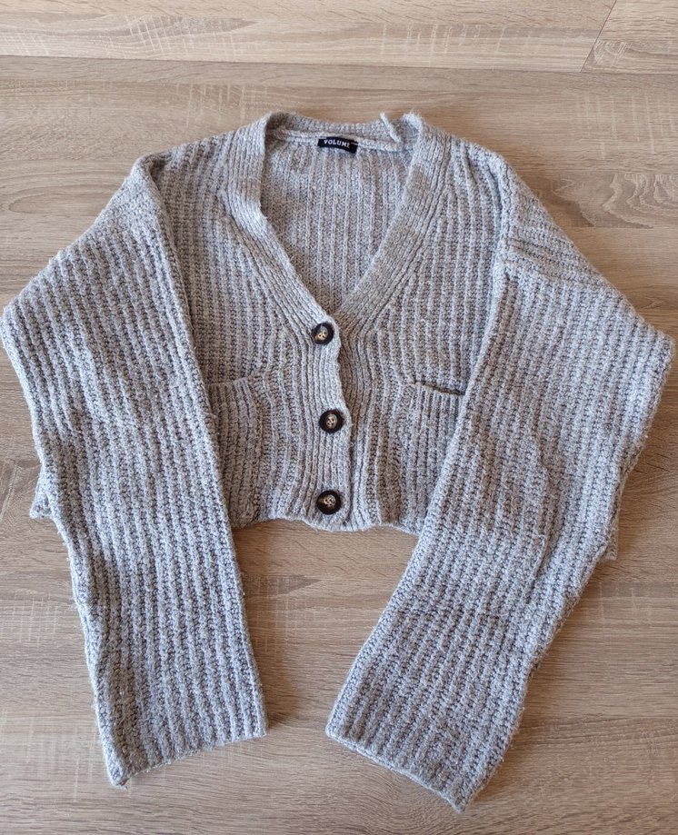 Gri renkli örgü kadın hırka, notlu yaka ve uzun kolludur. Bol kesim ve midi boyda, rahat ve sade bir görünüm sunar. Düğmeli kapama bulunur. S/m beden