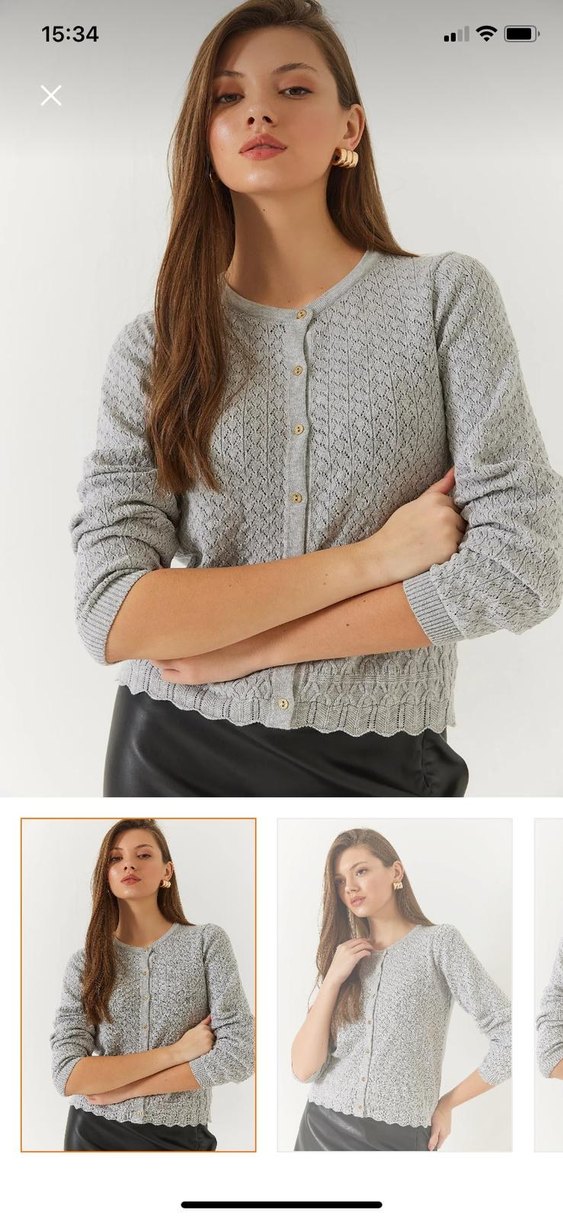 Fitted kesim, uzun kollu, düğmeli ve örgü dokulu gri kadın hırka.