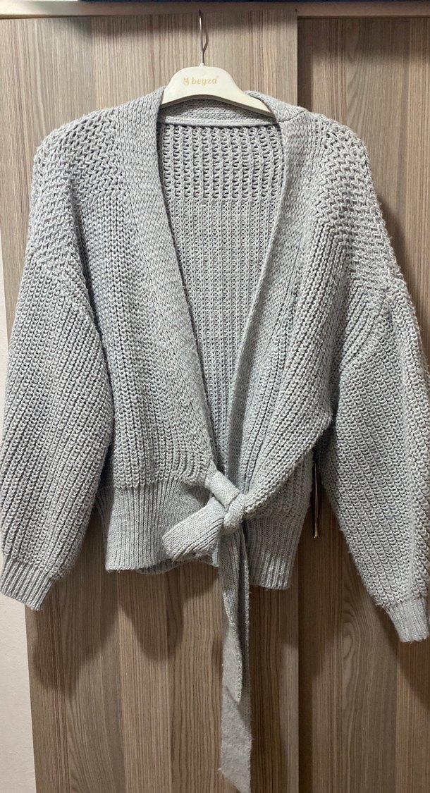 Gri örgü kadın hırka, bol kesim ve uzun kollu, halter yaka ve belde bağlama detayı ile rahat ve şık bir görünüm sunar.