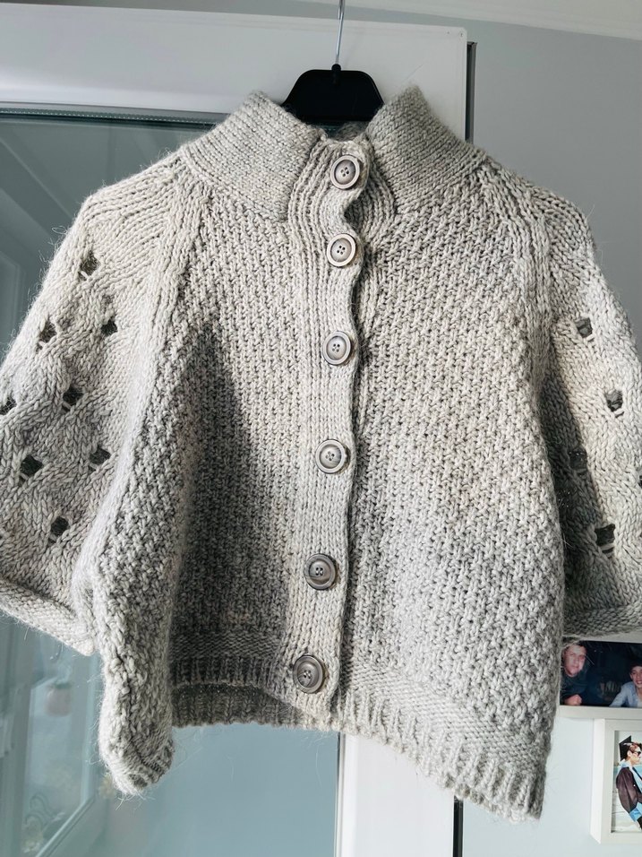 Bu kadın panço hırka, düğmeli ve örgü dokusuna sahip, yuvarlak yaka modelidir. Gri renkte, bol kesim ve midi boyda, günlük kullanıma uygundur. Rahat ve sade normcore tarzı sunar. El örgüsüdür içeriği ve ölçüleri fotoğraflarda mevcuttur.