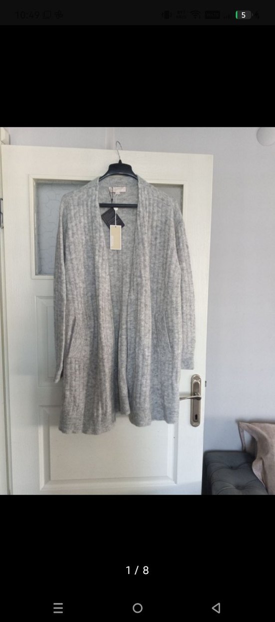Beymen L beden etiketi üstünde gri renkli, örgü dokulu, uzun kollu ve yuvarlak yaka, rahat kesim midi boy kadın hırka, iade kabul etmiyorum