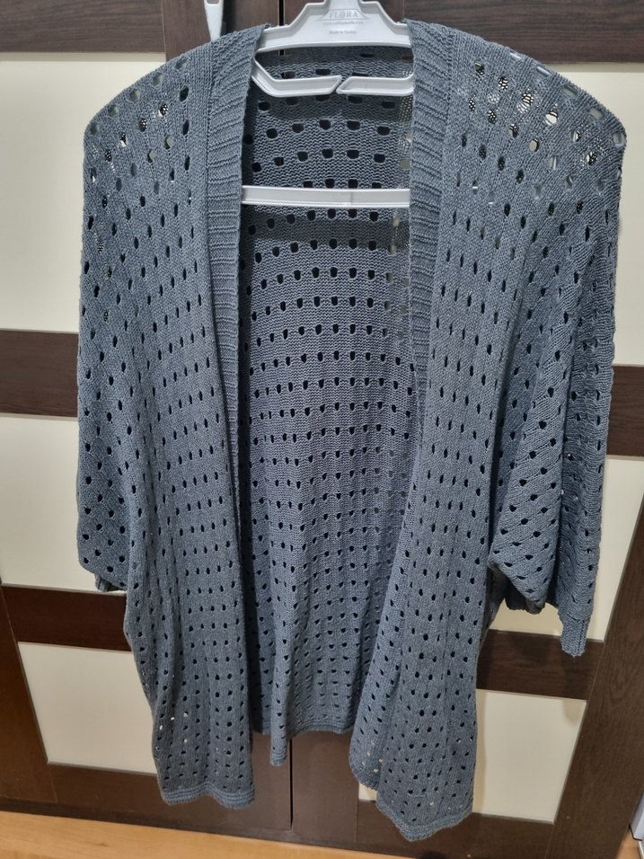 Gri renkli, örgü dokulu, midi boy ve bol kesim kadın hırka. Uzun kollu ve yakası çentikli, rahat ve günlük kullanıma uygun.