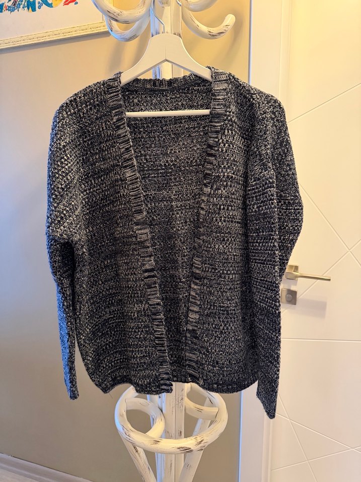 Gri renkli, bol kesim ve midi boyda örgü kadın hırka. Uzun kollu ve yuvarlak yakalı, rahat ve gündelik bohem tarzına uygun.