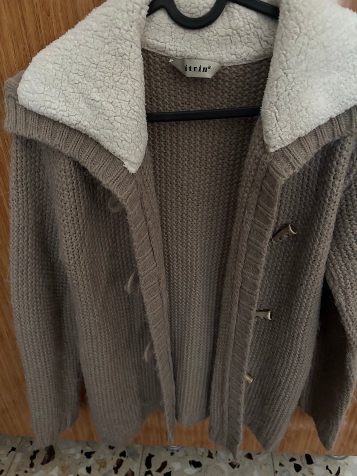 Gri renkli, örgü dokulu kadın hırka, notched lapel yakalı ve uzun kolludur. Rahat kesim ve midi boyda, yumuşak örme kumaştan üretilmiştir.