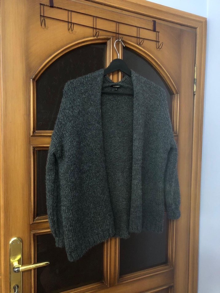 Gri yün örgü hırka, notlu yaka ve uzun kollu. Rahat kesim ve midi boy ile günlük kullanıma uygun.