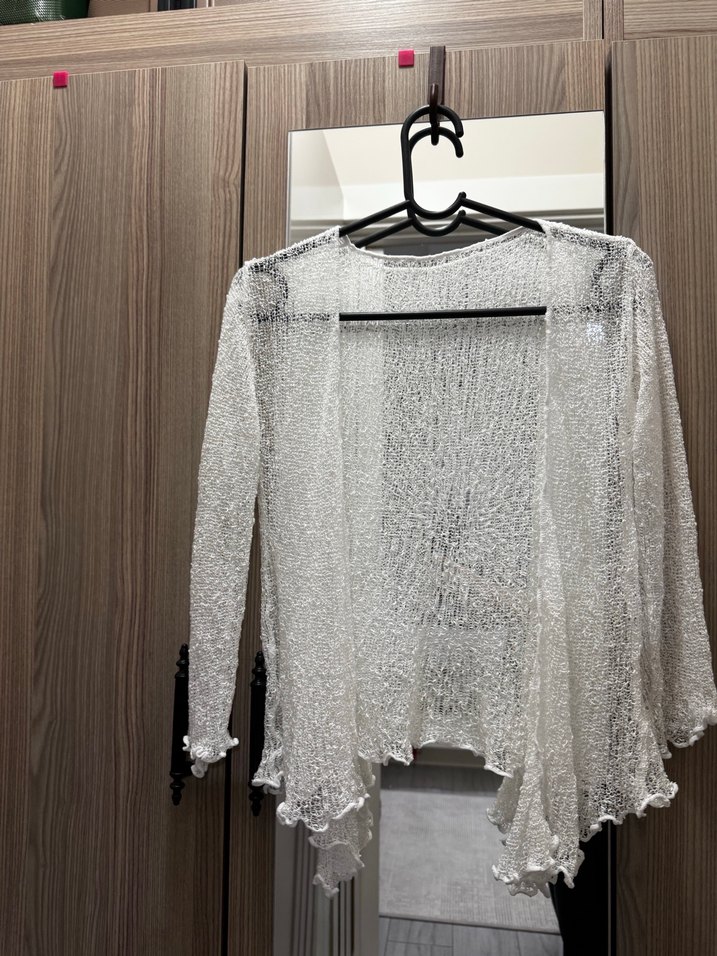 Beyaz örgü, straplez yaka ve bol kesim uzun kollu hırka. Midi boyda, rahat ve bohem tarzda, günlük kullanıma uygun.