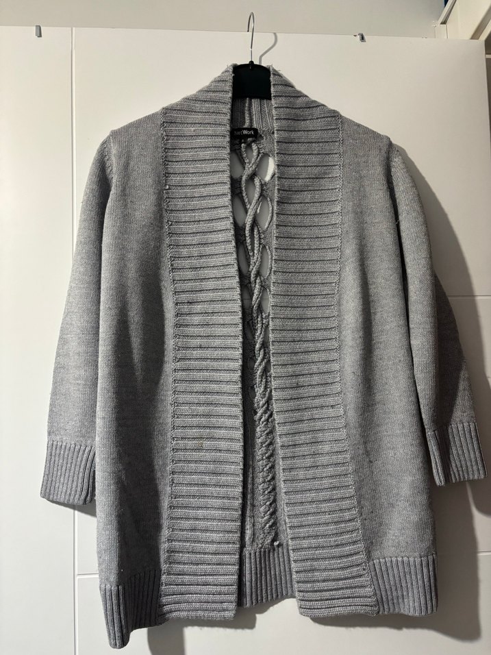 Gri örgü kadın hırka, notched yaka ve askılı kollu bol kesimle midi boyda. Günlük kullanıma uygun, rahat ve desenizdir. Arka detayi cok hos, sayili kullanildi