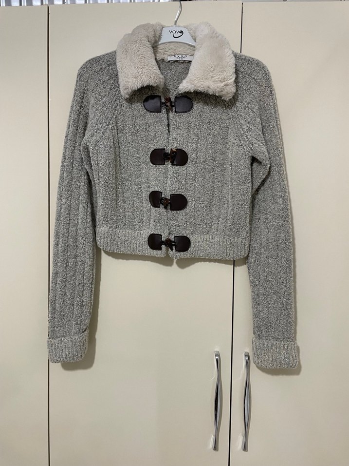 Yumuşak astarlı yakası ve düğmeli kapaması olan, fitted kesim gri örgü kadın hırka. Uzun kollu ve midi boyda, günlük sokak stili için uygundur.