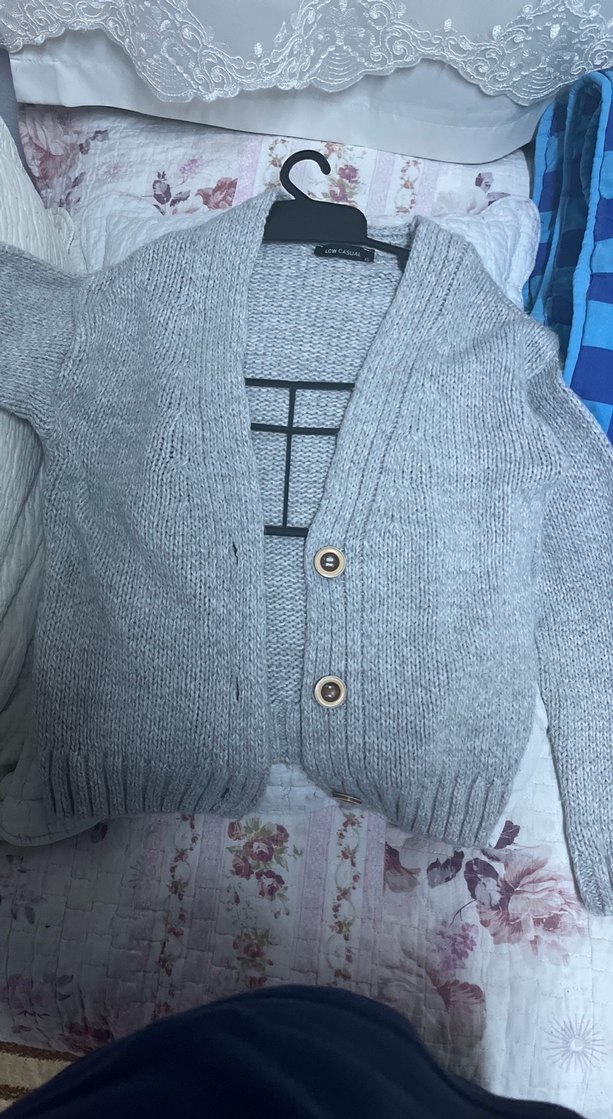 Gri renkli, örgü dokulu, uzun kollu ve gevşek kesimli kadın hırka. Notlu yaka ve iki düğmeli, midi boy rahat bir tasarıma sahiptir. Xs yazıyor ama M bedene de oluyor