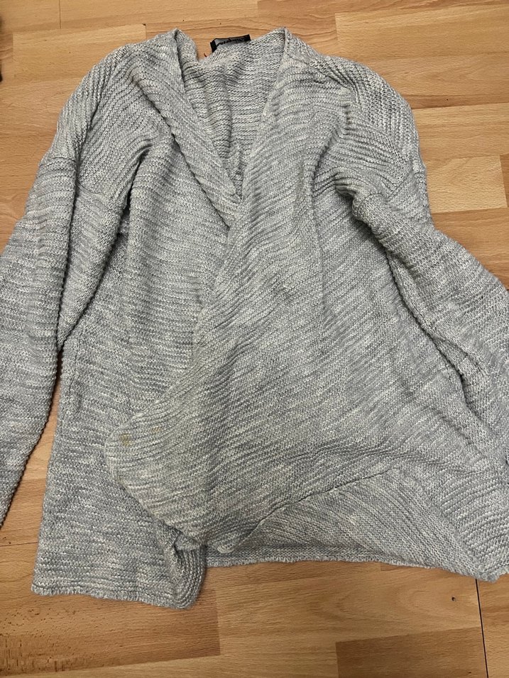 Gri renkli, uzun kollu ve yakalı örgü hırka. Yumuşak keten kumaştan, rahat kesim ve midi boyda, gündelik kullanıma uygun. Üzerinde ufak leke var ama yıkanınca geçer diye düşünüyorum