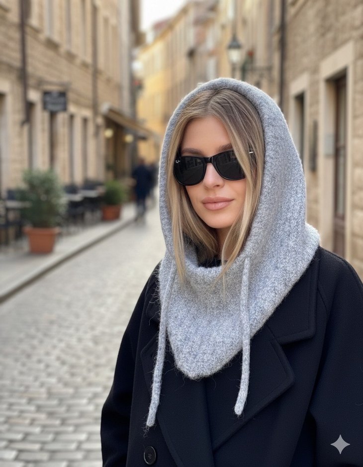 Gri örgü kadın bere, kapüşonlu tasarımıyla sıcaklık ve sokak stili sunar.