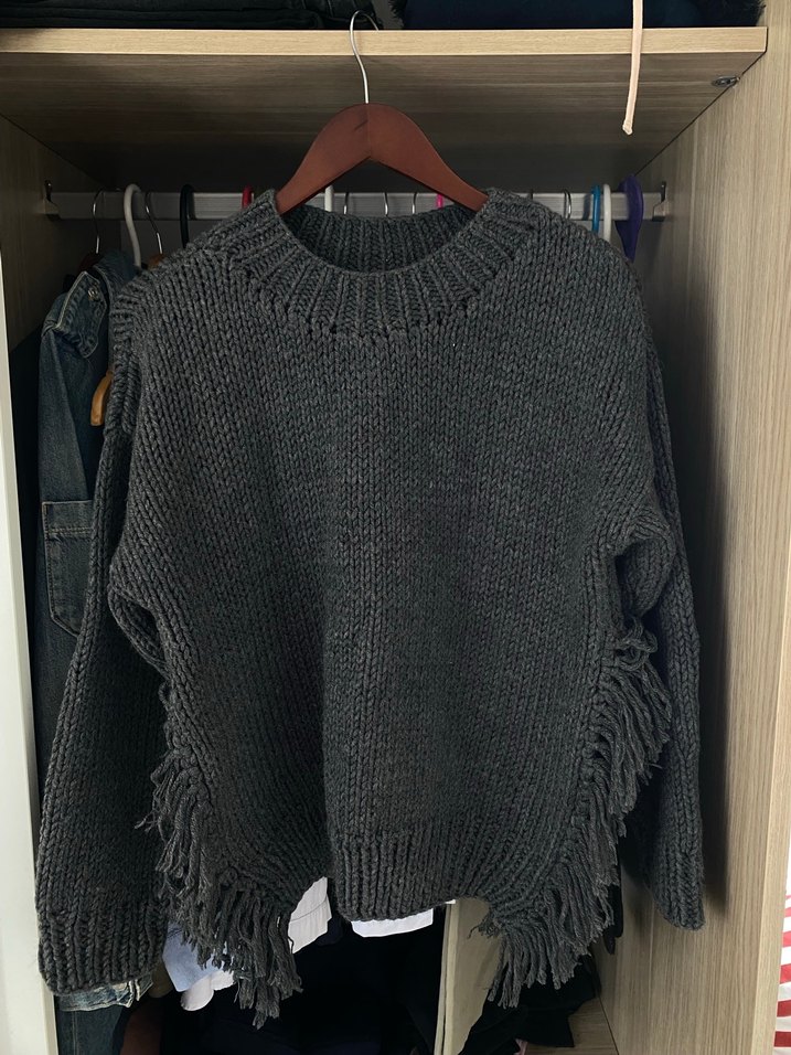 Gri örgü kazak, yuvarlak yaka ve uzun kollu, salaş kesim ve püskül detayları ile bohem tarzda. Günlük rahat kullanım için uygundur.