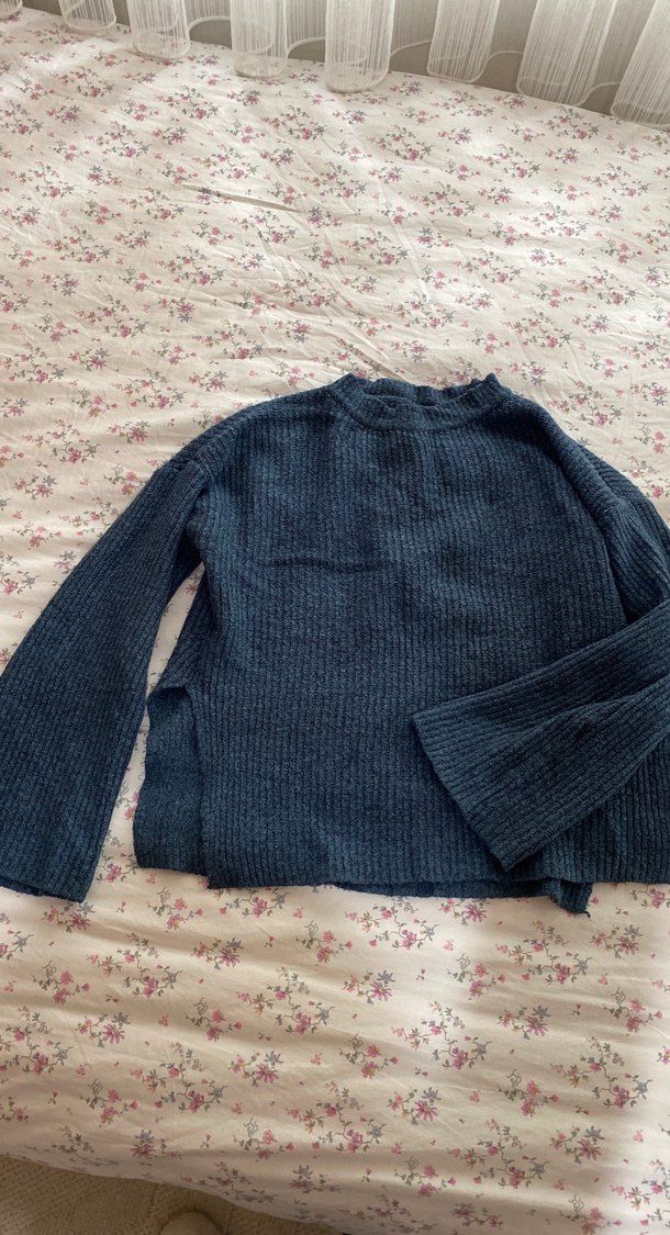 Gri örgü kadın kazak, bol kesim, uzun kollu ve yuvarlak yakalıdır. Normal midi boyda, desensiz ve rahat bir görünüm sunar.