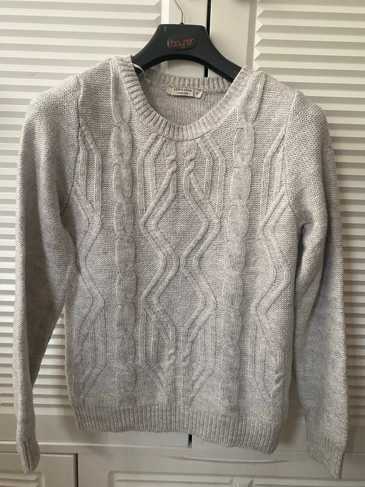 Gri renkli, yuvarlak yaka ve uzun kollu örgü kadın kazak. Rahat kesimli ve normal boyda, günlük kullanıma uygun sade tasarım, small beden sorunsuz