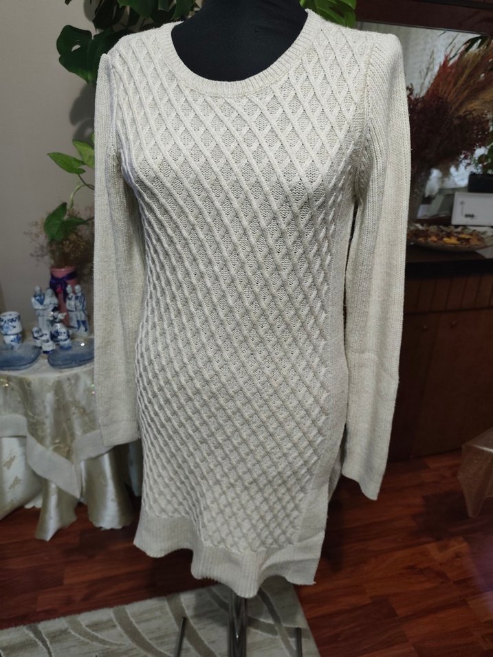 Gri örgü kadın kazağı, yuvarlak yaka ve uzun kolludur, bol kesimiyle rahat ve bohem bir tarz sunar.