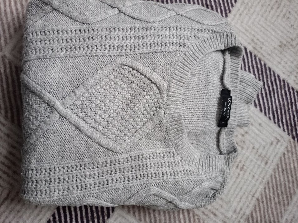 Gri örgü kadın kazağı, yuvarlak yaka ve uzun kolludur. Rahat dokusu ve normcore stiliyle günlük kullanıma uygundur.