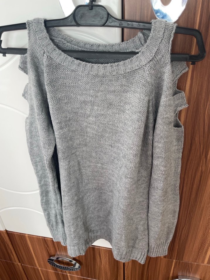 Gri örgü kadin kazak, uzun kollu, yuvarlak yakalı ve omuzları açık detaylıdır. Normal midi boyda, rahat kesimdir.