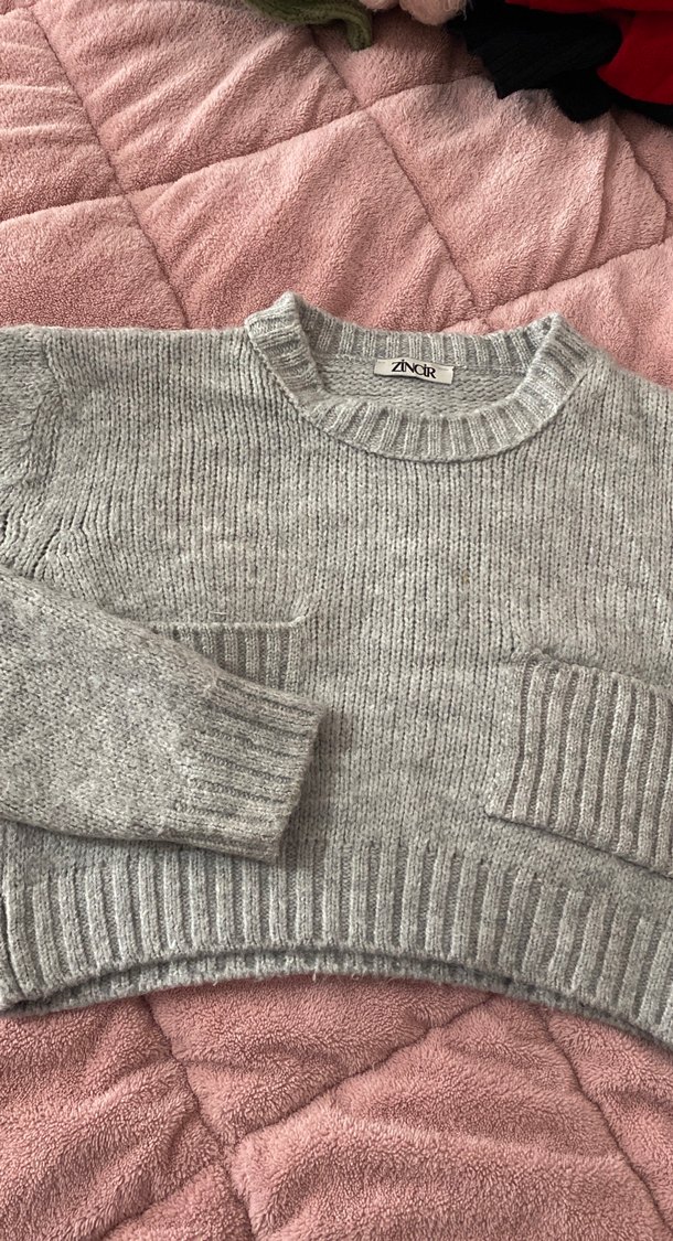 Gri örgü kazak, yuvarlak yaka ve uzun kollu. Salaş kesim ve normal boyda, günlük rahat kullanım için sade ve desensiz.