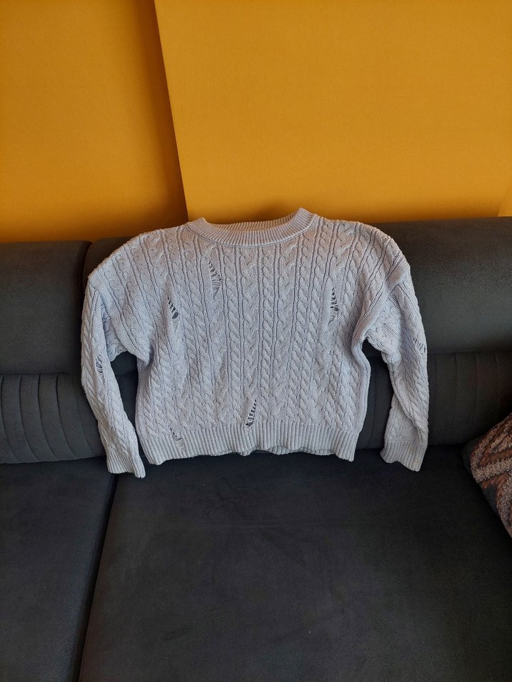 Gri renkli, örgü dokulu, uzun kollu, yuvarlak yaka ve normal boyda rahat kesim kadın kazak. Günlük kullanıma uygun konforlu normcore tarzda.