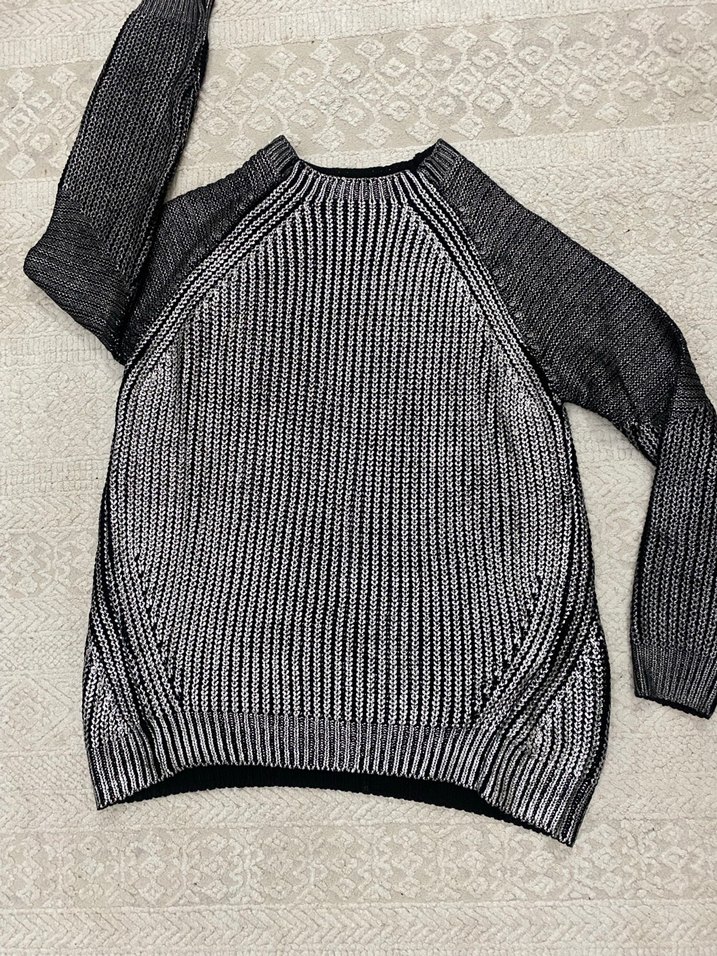 Gri renkte, yünlü örgü kumaştan, yuvarlak yaka ve uzun kollu, bol kesim rahat bir kadın sweatshirtü.