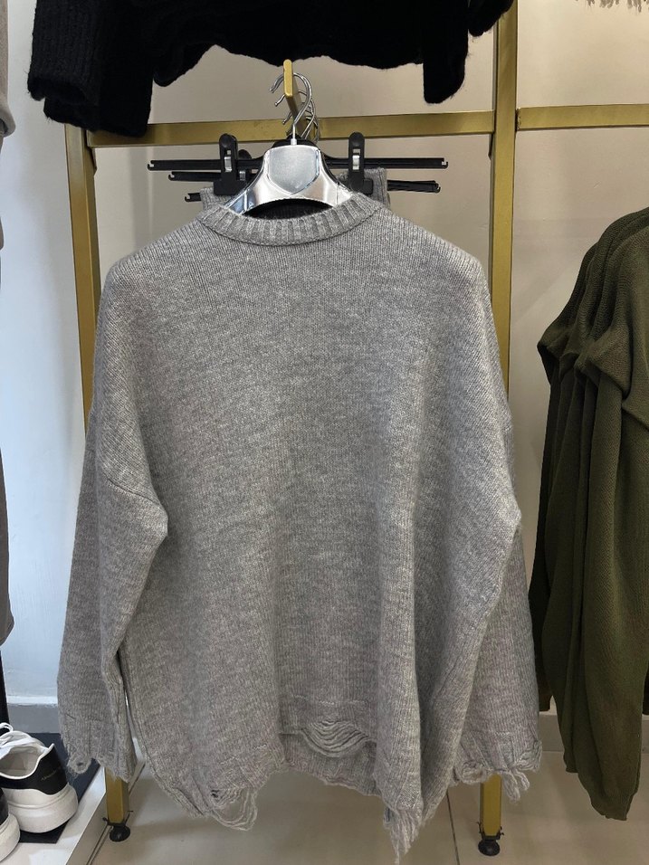 Gri renkli, örgü dokulu kadın kazak. Bisiklet yaka ve uzun kolludur, salaş kesimi ve normal uzunluğuyla rahat bir görünüm sunar.