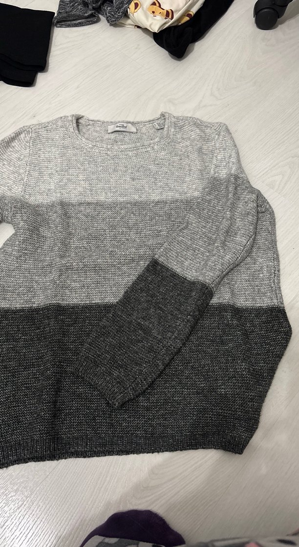Gri tonlarda, örgü dokulu, uzun kollu ve yuvarlak yakalı kadın kazak. Rahat kesimi ve sade tasarımıyla günlük kullanıma uygundur.