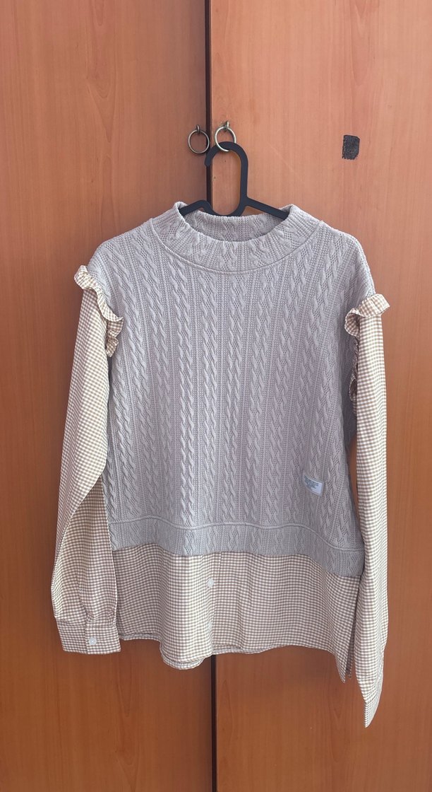 Gri örgü kadın kazak, uzun kollu ve yuvarlak yaka tasarıma sahiptir. Bej desenli kumaş detaylarıyla rahat ve gündelik bir görünüm sunar. Günlük kullanım için uygundur.