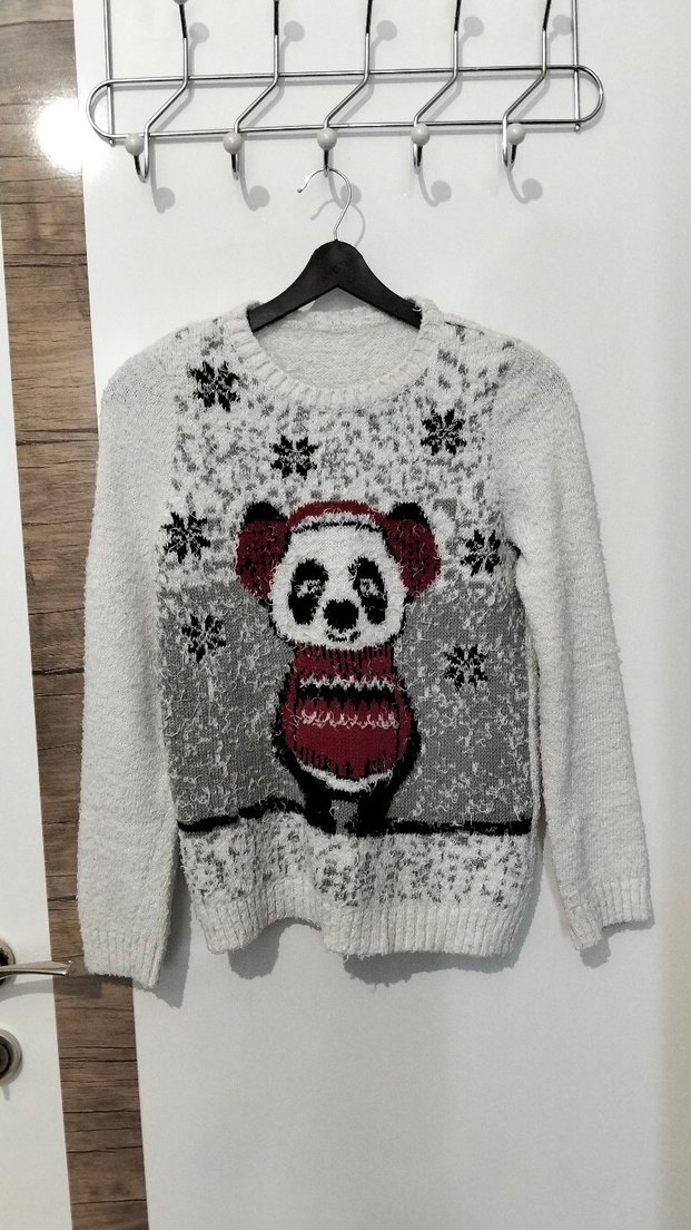Gri örgü kumaştan, yuvarlak yakalı ve uzun kollu, bol kesim kadın kazak. Üzerinde panda desenli baskı bulunur, günlük rahat kullanım için uygundur. ANKARA İÇİ ELDEN SATIŞ İMKANI BULUNUR