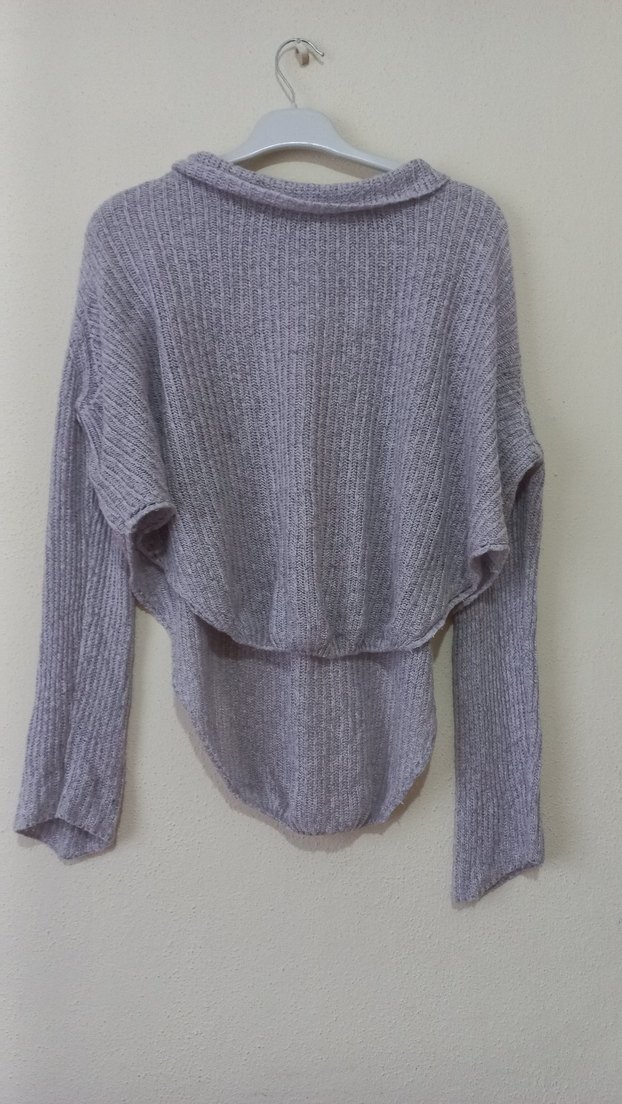 Gri renkli, örgü dokulu, yuvarlak yaka ve uzun kollu kadın kazak, rahat kesimi ve kısa boyuyla günlük kullanıma uygundur. arka tarafı uzundur . 68 cm. bol kesimdir. M L XL olur.