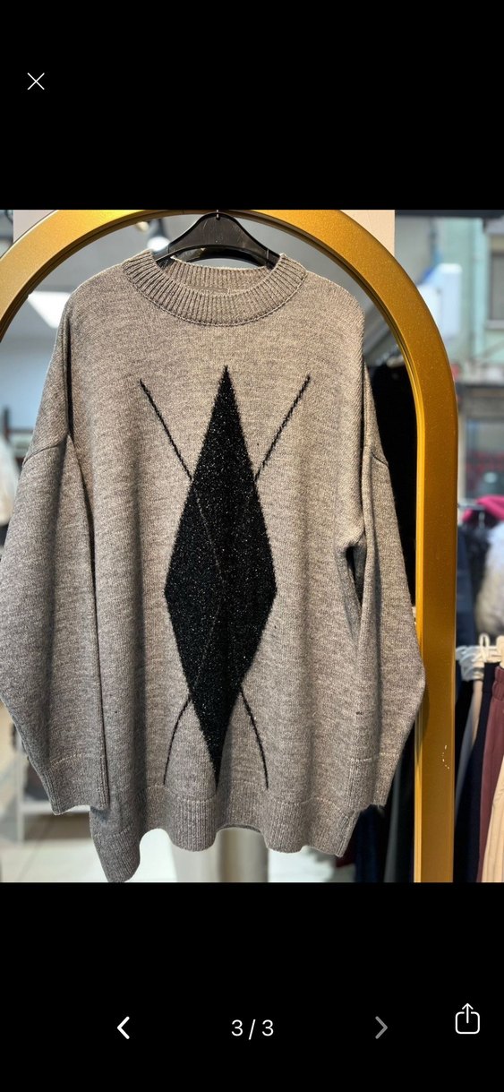 Bu kadın kazağı, örgü dokusu, yuvarlak yaka ve uzun kollara sahiptir. Salaş kesimi ve gri rengiyle, ortasında siyah geometrik desen bulunur. Günlük sokak stili için uygundur.