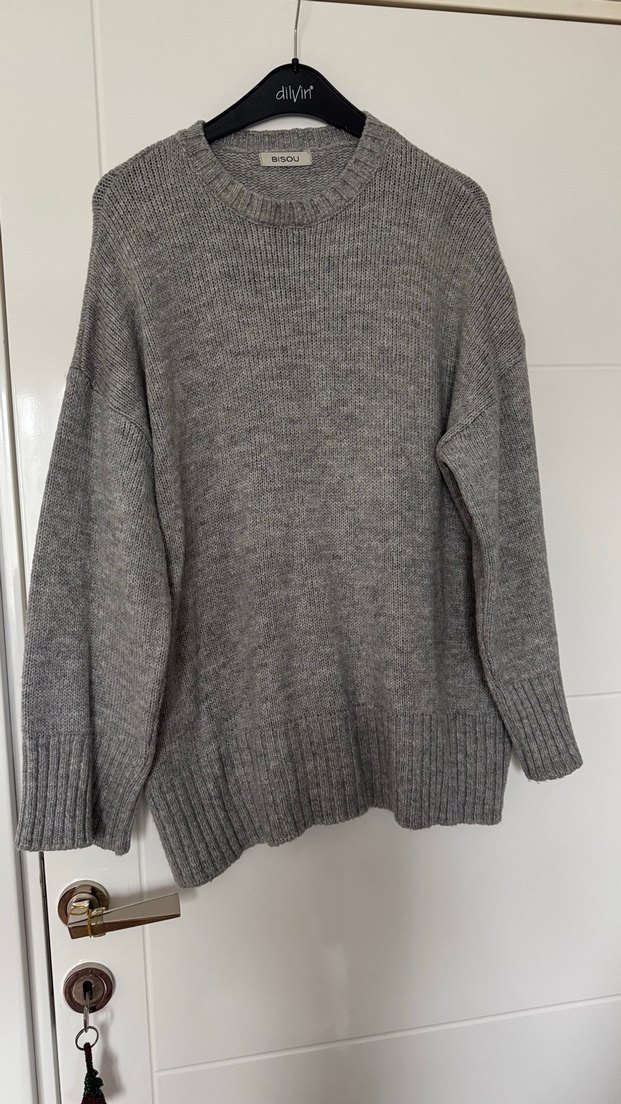 Boyu 76 eni 63 cm Gri renkli, örgü yün kumaştan üretilmiş, yuvarlak yaka ve uzun kollu, bol kesim kadın kazak. Desensiz ve midi boyda, günlük rahat kullanıma uygundur.