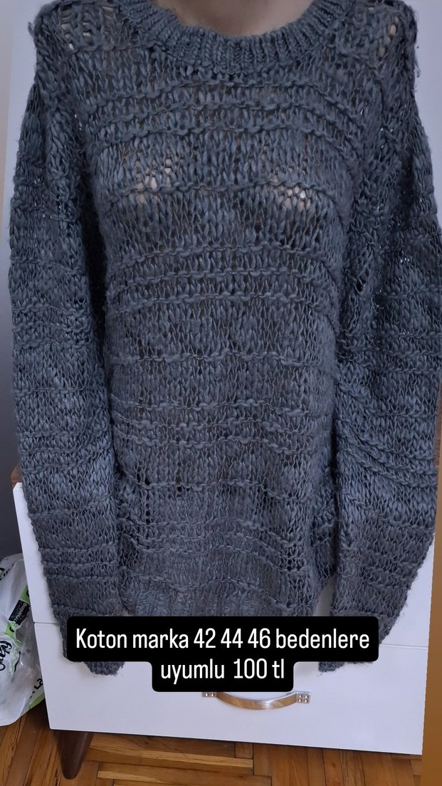 Gri renkli, uzun kollu, yuvarlak yakalı, bol kesim örgü kazak. Normal midi boyda, 42, 44, 46 bedenlere uyumlu. Koton marka ile uyumlu, fiyatı 100 TL.