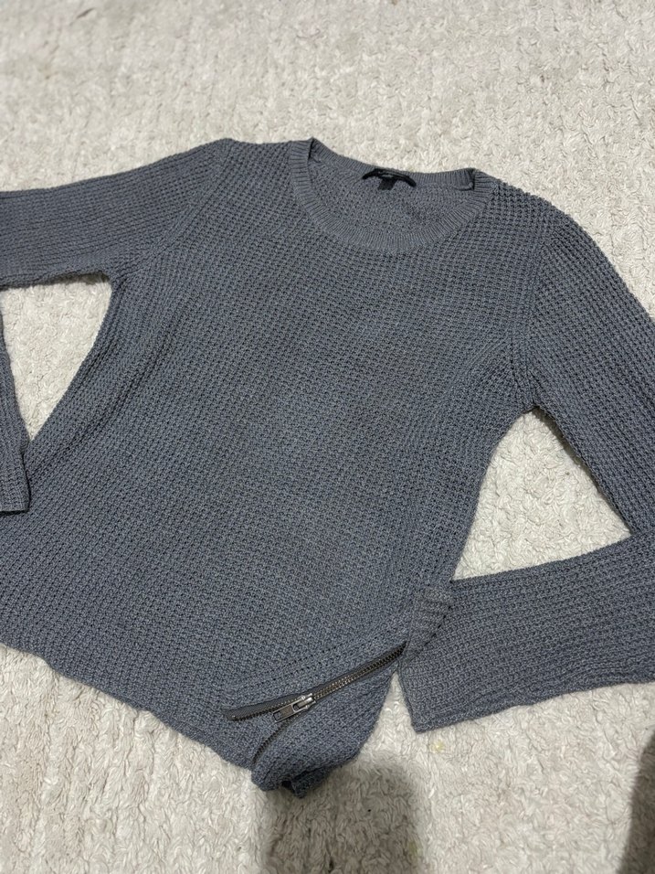 Gri renk, örgü kumaştan yapılmış, uzun kollu ve bisiklet yaka rahat kesim kadın kazak. Günlük kullanıma uygun, sokak modasına uygun tarzda.