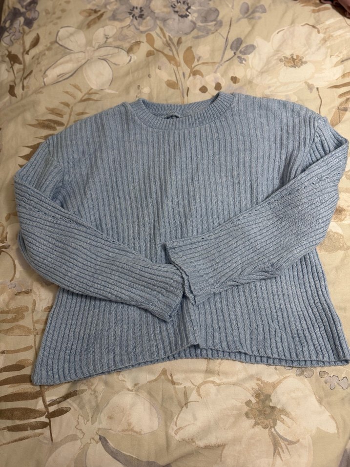 Gri renkli, örgü dokulu kadın kazak, yuvarlak yaka ve uzun kollu, salaş kesim ile günlük rahatlık ve şıklık sunar.