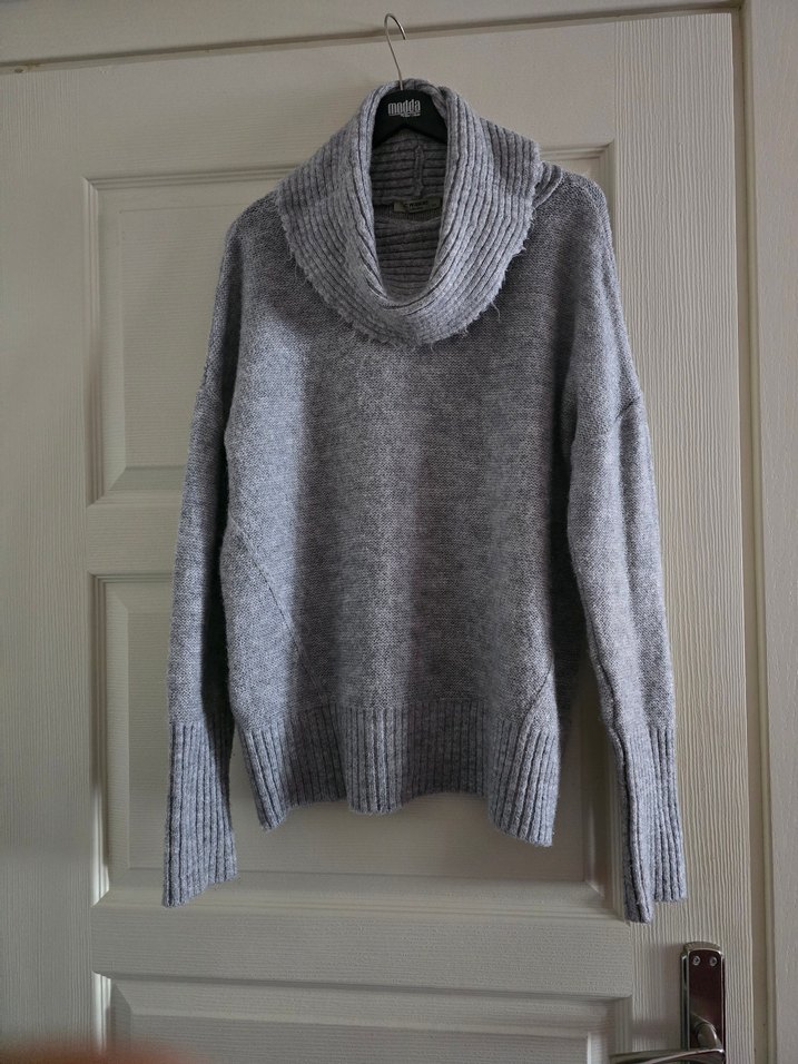 Bu gri örgü kadın kazağı, yüksek yakalı ve uzun kollu, bol kesimiyle rahat ve sıcak bir stil sunar.