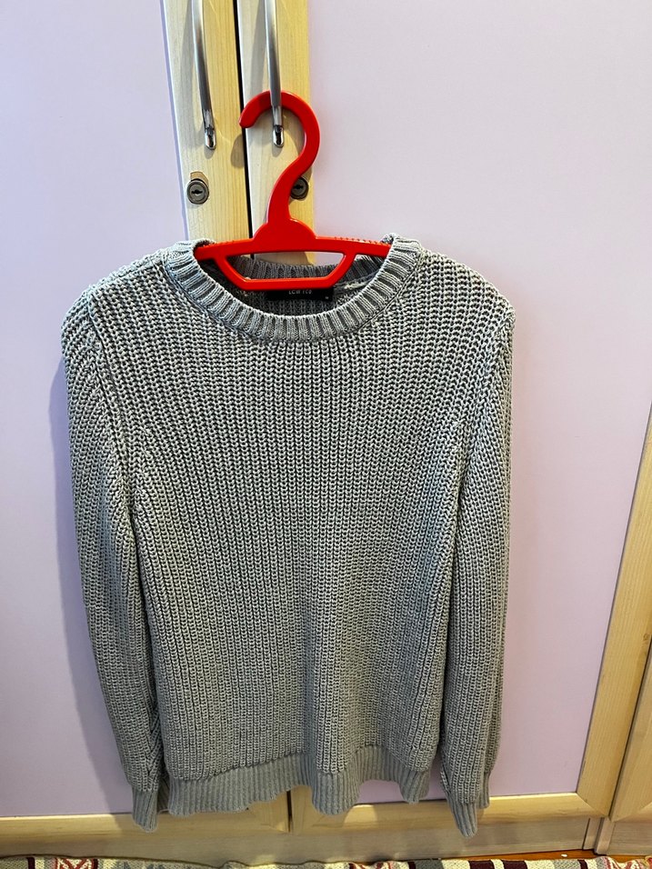 Bu dar kesim kadın kazak, gri örgü kumaş, yuvarlak yaka ve uzun kollara sahiptir. Normal boyu ve rahat örgü yapısıyla günlük kullanıma uygundur.